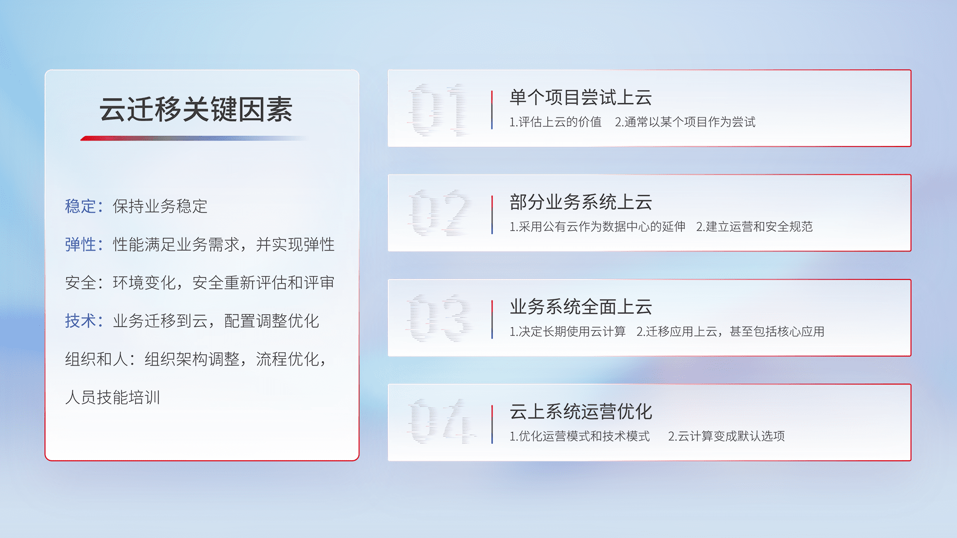 结合实际业务,,,,从规划设计、、、云平台选型、、云原生改造、、数据迁移、、集成交付,,,迁移全过程为客户识别最佳上云路径,,做好风险识别管理,,设计网络架构、、、身份权限、、、、安全审计合规、、操作审计、、日志审计、、、监控告警策略、、、、多站点容灾设计等,,,,对云上基础设施进行整体规划,,提升IT治理水平,,,,以满足弹性、、高可用、、、、高性能的需求。。