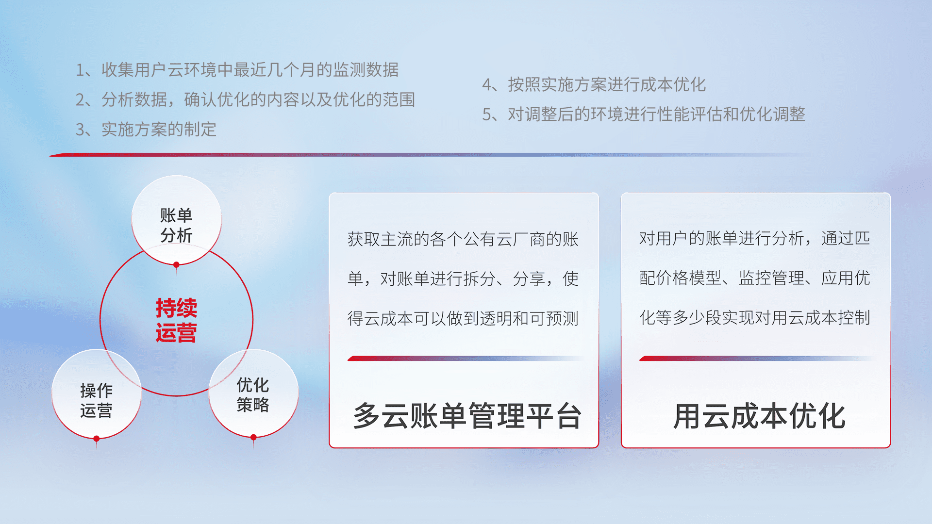 通过多云纳管,,以统一的资源数据模型把客户的云资源进行抽象和封装,,,进而实现对多云资源的统一操作,,保障云资源管理的可靠性、、、稳定性与可用性。。。。量身定制化运维内容,,配置、、、、开发运维、、、、补丁管理、、、备份、、、监控、、认证和访问管理、、、审计和日常巡检等,,保障在用云过程中的可靠度,,稳定度以及高可用率。。。。